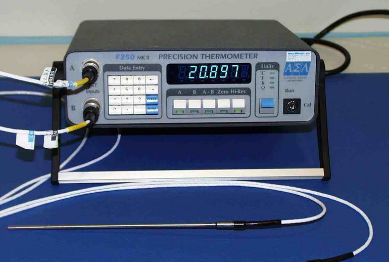 We use a Fluke 5626 Secondary Reference PRT with ASL F250 Precision AC Bridge readout.