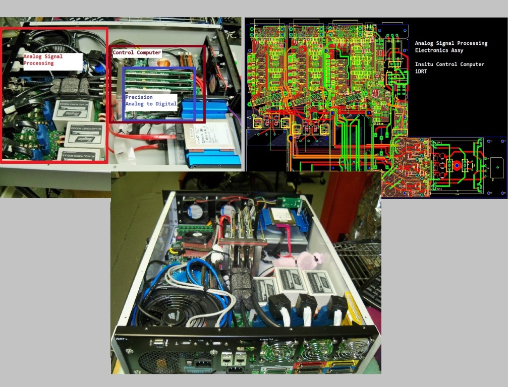 The electronics inputs the sensor information, analog signal processing, does the digital electronics FPGA for wafer synchronization and timing for the motion of the platter. The Precision Analog to Digital converters feed that information into the computer, the Software logs the data, sends it out Ethernet to the main control computer, and generates the user display real time pictures.